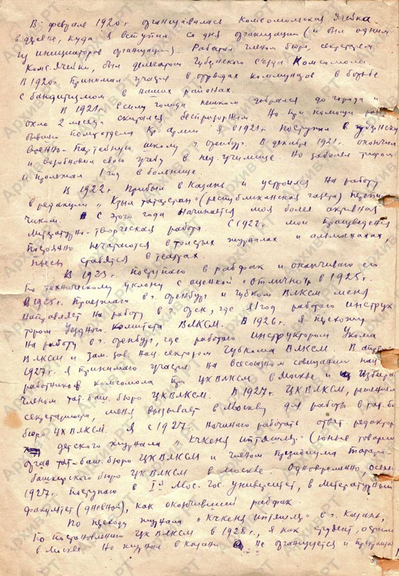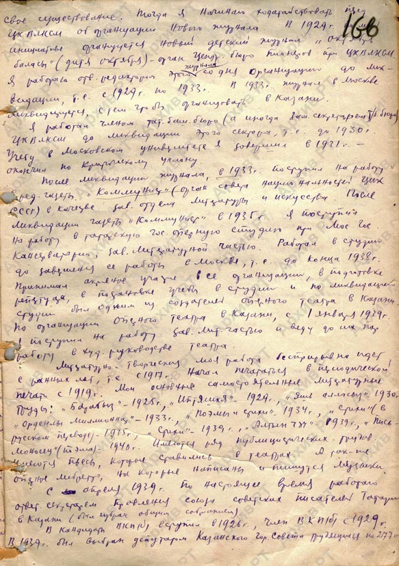 Автобиография написана в связи с утверждением М. Джалиля на должность ответственного секретаря правления Союза советских писателей Татарской АССР для предъявления в отдел кадров Татарского обкома ВКП (б) (номенклатурная должность). Документ охватывает период с 1913 по 1940 гг., коротко отмечены все значительные события в биографии поэта: учеба в медресе, военно-партийной школе, педагогическом училище, на рабфаке, 1-ом Московском государственном университете; работа инструктором укома ВЛКСМ в Орске и Оренбурге, редакциях различных газет и журналов в Москве и Казани; события гражданской войны в г. Оренбурге и в родной деревне Мустафино, голода 1921 года; участие в работе по созданию татарского оперного театра; о литературно-творческой работе с 1919 г.; о вступлении в ВЛКСМ и ВКП (б); об избрании депутатом Казанского городского Совета в 1939 г. Имеются сведения о родственниках поэта: отце, матери, братьях и сестрах, семейном положении. Документ содержит ряд новых и важных деталей из автобиографии М. Джалиля, как то, что его мать была дочерью муллы и факт раскулачивания брата отца.