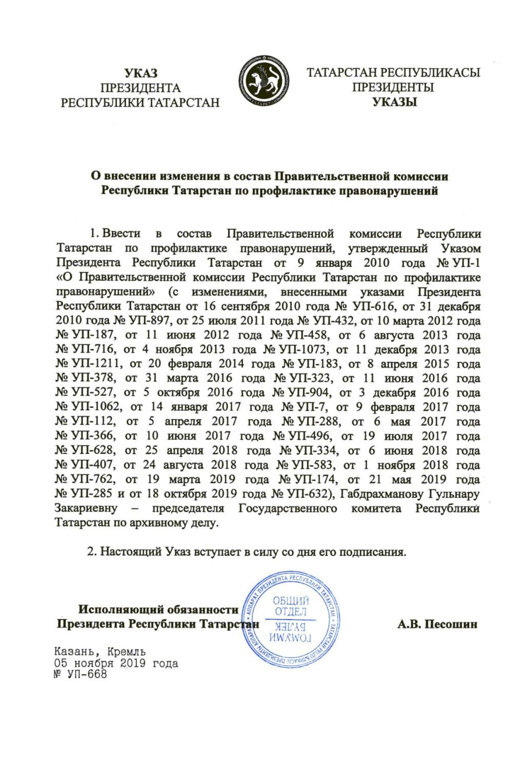 Указ президента Республики Татарстан "О внесении изменения в состав Правительственной комиссии Республики Татарстан по профилактике правонарушений"