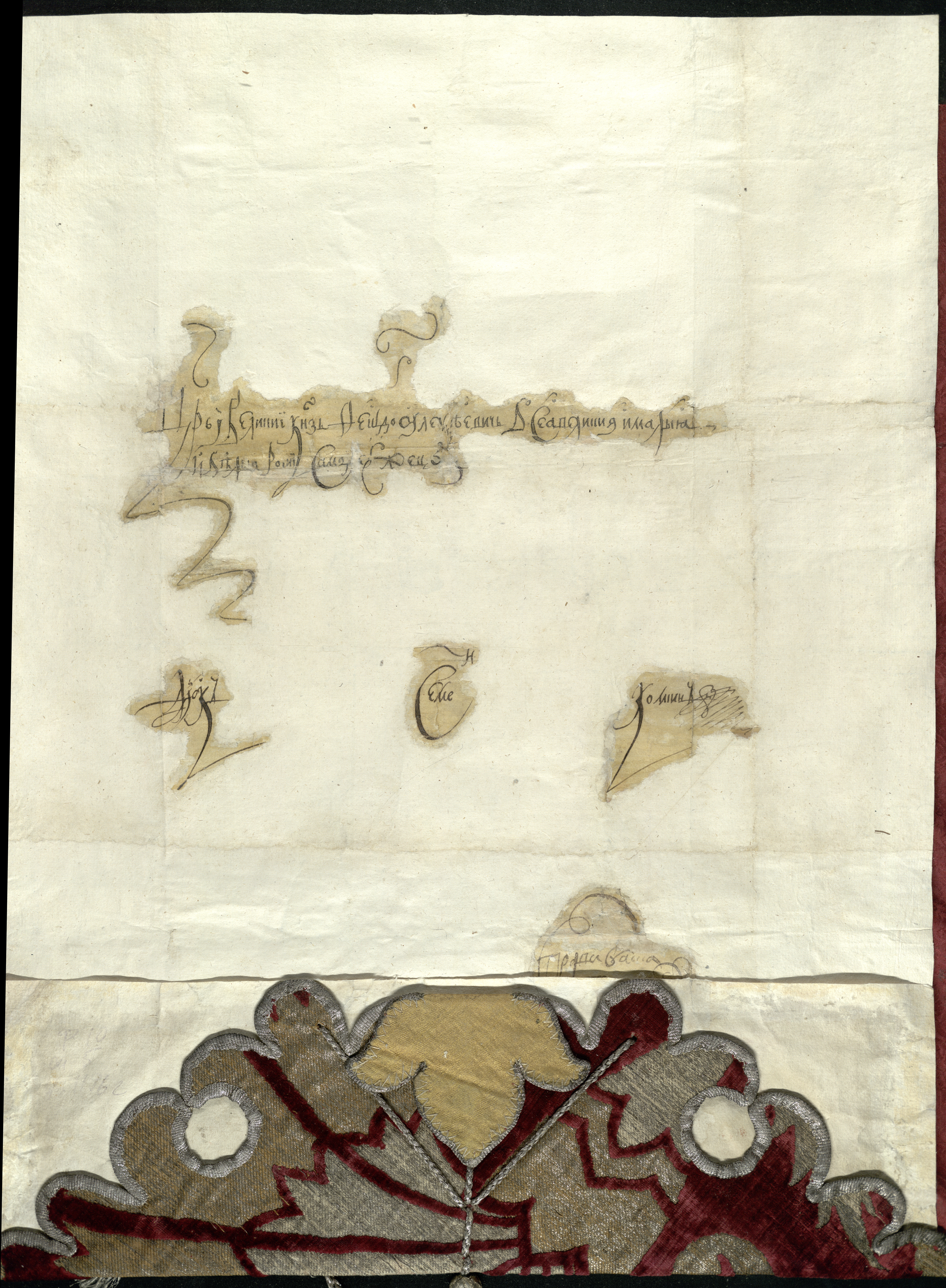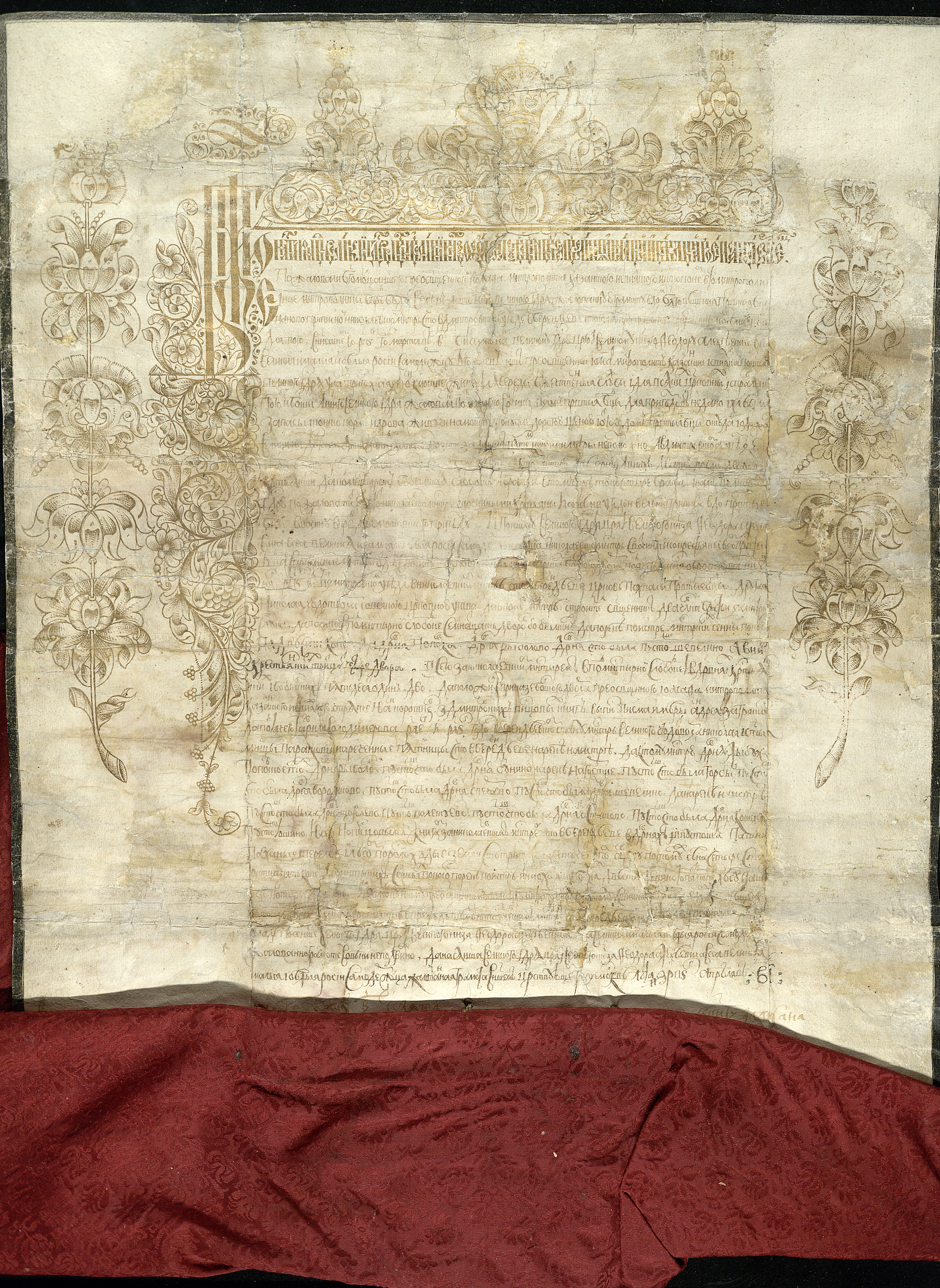 Текст украшен заставкой в стиле московского барокко и заголовком, выполненным вычурной вязью с именем и титулом царя Федора Алексеевича. Грамота оформлена бордовой шелковой тканью, на обороте внизу на тканевой основе имеется серебристый крученый шелковый шнур от печати.